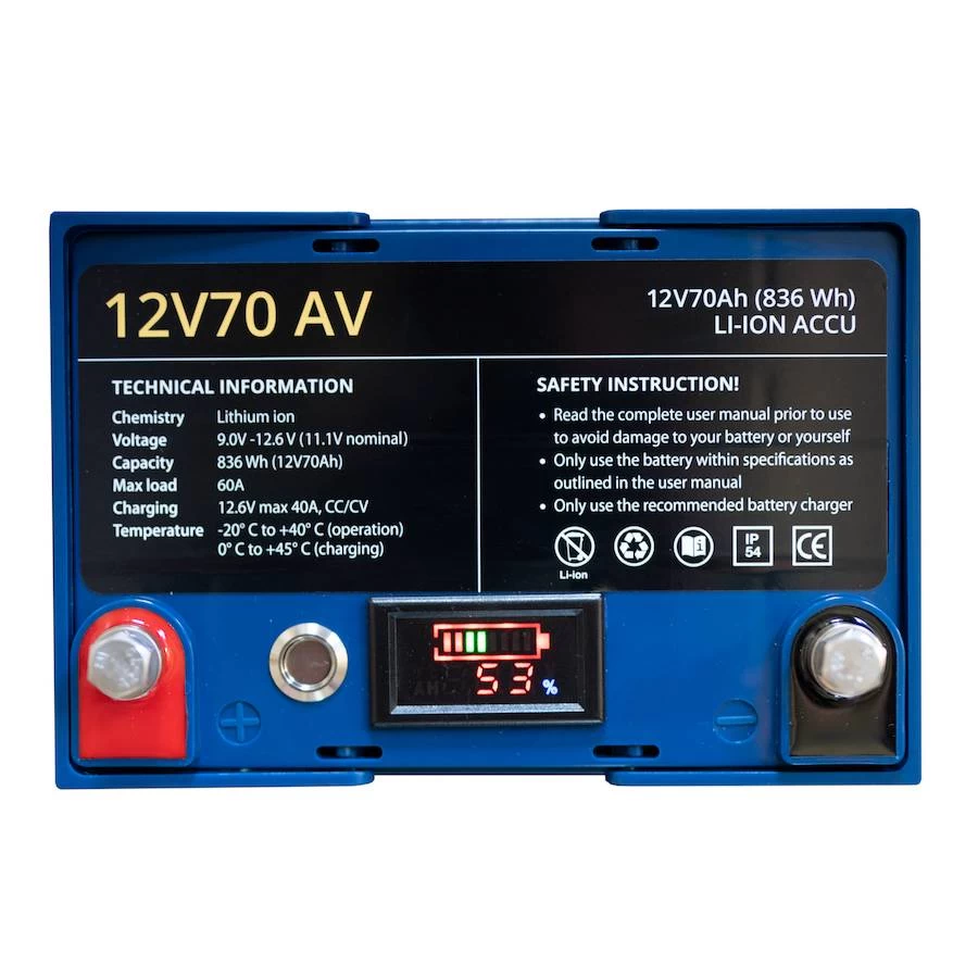 Nieuw in onze collectie is de12V70 AV li-ion accu met digitale accu-indicator, voor de volgende toepassingen: