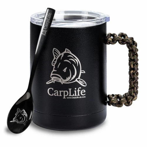 Deze carplife matzwarte dubbelwandige roestvrijstalen thermische mok met de geëtste zwarte roestvrijstalen theelepel, zijn een must-have voor iedere karpervisser.